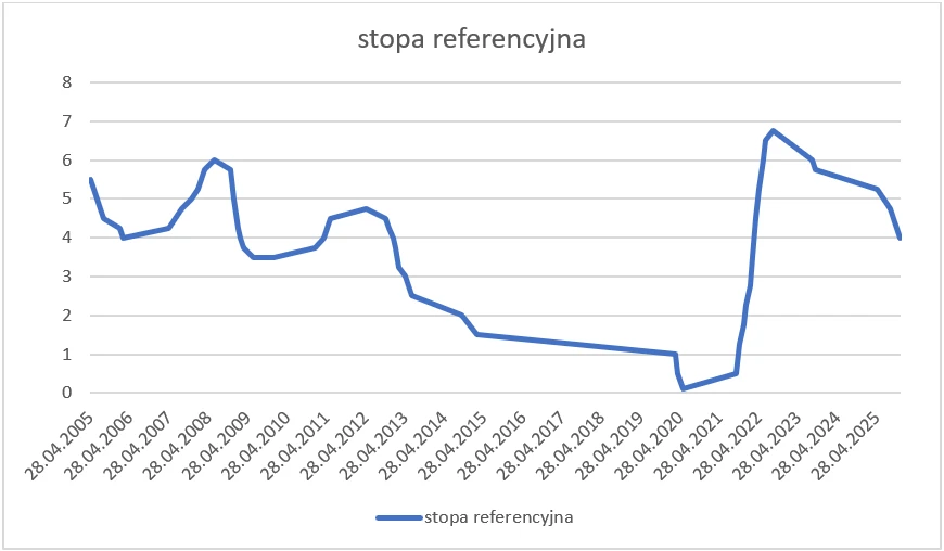 Prezentowany poniżej wykres pokazuje zmiany stopy referencyjnej na przestrzeni ostatnich 20 lat, do grudnia 2025 r.